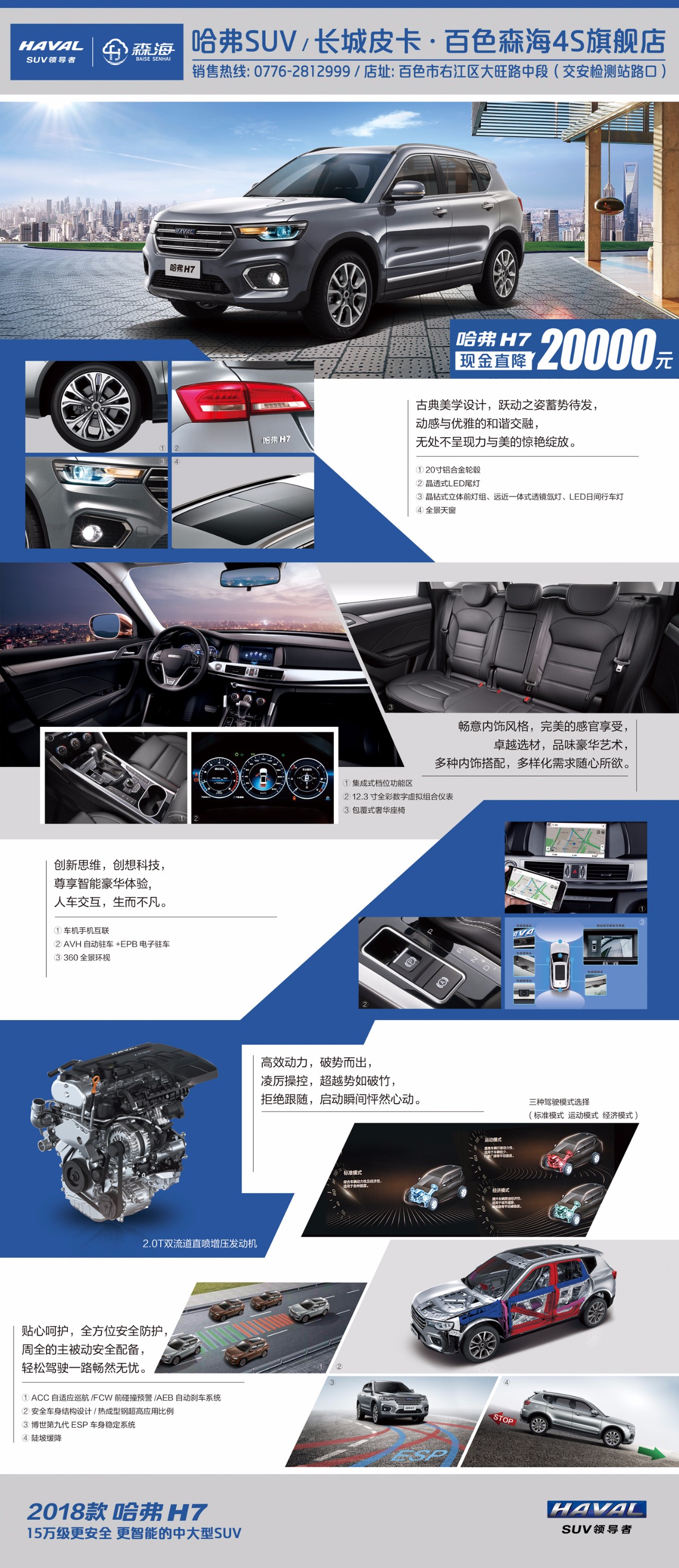 煥新外觀造型彰顯威猛霸氣 2018款哈弗H7在外觀上增加了更多的剛猛元素,新車(chē)在前杠、前后組合燈、翼子板,后背門(mén)等多個(gè)部位采用了全新造型,散發(fā)著濃郁荷爾蒙氣質(zhì),在彰顯運(yùn)動(dòng)氣質(zhì)的同時(shí),外觀更富張力,很好地增強(qiáng)了外觀的視覺(jué)沖擊力,引領(lǐng)了設(shè)計(jì)潮流。 2018款車(chē)型的內(nèi)飾更具豪華范。中控臺(tái)采用多層次立體設(shè)計(jì)風(fēng)格,真皮、拉絲金屬與搪塑多種不同質(zhì)感材質(zhì)的組合將內(nèi)飾的豪華質(zhì)感烘托而出。此外,新車(chē)還將中控,方向盤(pán),肘枕,車(chē)門(mén)扶手等位置更改為細(xì)皮紋,很好地增加了細(xì)膩感。同時(shí),用戶經(jīng)常接觸的部位,如肘托,均使用了觸感細(xì)膩柔軟的PU或真皮材質(zhì),使整車(chē)內(nèi)飾更具品質(zhì)感。 極致安全保障一路暢行無(wú)憂 作為哈弗SUV安全技術(shù)的集大成者,2018款哈弗H7在安全配置層面上的全面武裝直逼豪華車(chē)水準(zhǔn)。新車(chē)配備了ACC自適應(yīng)巡航、FCW前預(yù)碰撞系統(tǒng)、AEB自動(dòng)剎車(chē)系統(tǒng),并且全系標(biāo)配360全景環(huán)視、疲勞駕駛監(jiān)測(cè)系統(tǒng)等諸多高科技安全配置。 2018款哈弗H7全車(chē)采用高剛性安全結(jié)構(gòu)車(chē)身,并大量采用高強(qiáng)度鋼及熱成型鋼,為駕乘人員提供更安全的駕乘環(huán)境。此外,還采用了全框式前副車(chē)架,在提升車(chē)身整體的剛性、穩(wěn)定性和抓地力的同時(shí),還能有效過(guò)濾顛簸,讓用戶的駕乘安心更舒心。18款哈弗H7將被動(dòng)安全技術(shù)與主動(dòng)安全技術(shù)完美融合,為用戶提供了高效智能的五星級(jí)安全呵護(hù)。 智能駕控體驗(yàn)勁享科技互聯(lián)樂(lè)趣 新車(chē)配備智能啟停功能,在降低發(fā)動(dòng)機(jī)怠速空轉(zhuǎn)時(shí)間的同時(shí)幫助駕駛者更加舒適自如的應(yīng)對(duì)紅綠燈等車(chē)輛啟停需求,更能有效避免發(fā)動(dòng)機(jī)空轉(zhuǎn)帶來(lái)的尾氣排放與燃油消耗。除此之外,2018款哈弗H7還擁有360環(huán)視、電子手剎(EPB)、自動(dòng)駐車(chē)、車(chē)機(jī)手機(jī)互聯(lián)(carlife)系統(tǒng)等多種智能配置,將互聯(lián)融入用車(chē)生活,不管是車(chē)流不息的城市,還是遠(yuǎn)離喧囂的鄉(xiāng)村野外,哈弗H7都能用科技為駕乘者帶來(lái)便捷、豐富多彩的智能用車(chē)體驗(yàn)。 大空間高配置臻享豪華舒適駕乘 新車(chē)全系標(biāo)配超大全景天窗,讓藍(lán)天美景一覽無(wú)余。主銷(xiāo)車(chē)型更是標(biāo)配12.3寸全彩虛擬組合儀表,配置奢華,堪比豪華品牌。為乘客量身打造的柔軟舒適、質(zhì)感細(xì)膩的座椅極富包裹性和支撐性。哈弗H7采用高規(guī)格的內(nèi)飾設(shè)計(jì),中控臺(tái)、手套箱、兩側(cè)門(mén)板都使用觸感柔軟的搪塑工藝設(shè)計(jì)。中控臺(tái)采用多層次立體設(shè)計(jì)風(fēng)格,真皮、拉絲金屬與搪塑多種不同質(zhì)感材質(zhì)的組合將內(nèi)飾的豪華質(zhì)感烘托而出。 2018款哈弗H7的車(chē)身尺寸為4715*1925*1718mm,軸距為2850mm,為消費(fèi)者提供了舒適的乘坐空間,后排可以輕松容下三個(gè)“分量十足”的成年男人。同時(shí),哈弗H7的儲(chǔ)物空間也是頗為令人滿意。后備箱最大擴(kuò)展空間可達(dá)1232L,大箱小包,即使是全家的行李都能完全HOLD住。 寬適的空間,豪華精良的配置,2018款哈弗H7給予消費(fèi)者超越期待的舒適駕乘享受,讓用戶擁有更高品質(zhì)的用車(chē)生活。 強(qiáng)勁高效動(dòng)力縱享駕馭激情 2018款哈弗H7搭載2.0T雙流道直噴渦輪增壓發(fā)動(dòng)機(jī),在可靠的雙流增壓器、燃油缸內(nèi)直噴技術(shù)和雙VVT既可變氣門(mén)升程技術(shù)的組合下,有效實(shí)現(xiàn)高效動(dòng)力輸出,最大功率170KW,最大扭矩355N•m。與之匹配的格特拉克6速濕式雙離合變速器,換擋邏輯清晰迅速。此外,哈弗H7還設(shè)有運(yùn)動(dòng)、標(biāo)準(zhǔn)、經(jīng)濟(jì)三種駕駛模式,不同的駕駛模式,帶來(lái)不一樣的精彩,讓用戶享受不一樣的生活Style。 2018款哈弗H7將憑借更安全、更智能的姿態(tài),在競(jìng)爭(zhēng)白熱化的SUV市場(chǎng)搶奪一席之地,在同級(jí)別產(chǎn)品中,以絕對(duì)的產(chǎn)品優(yōu)勢(shì)贏得用戶的信賴。哈弗H7將用傳承與突破,給你帶來(lái)超越期待的心動(dòng)體驗(yàn)。 |