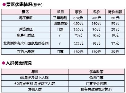 本報訊(記者 孟娟娟)國慶出游福利來啦!昨日,記者從自治區(qū)物價局獲悉,根據(jù)中央部署,廣西陸續(xù)降低國有景區(qū)門票價格。據(jù)統(tǒng)計,截至昨日,全區(qū)已降低或在國慶前降低價格的景區(qū)共99個,降價幅度大部分在20%左右,有的甚至達30%。 今年以來,廣西各級價格主管部門加快完善景區(qū)門票價格形成機制,加強旅游服務(wù)價格管理,著力做好降低重點國有景區(qū)門票價格工作。 在9月1日前,廣西分別降低了桂林象山景區(qū)等11個景區(qū)價格。9月13日,自治區(qū)物價局再次下發(fā)緊急通知,要求在今年“十一”黃金周前再降低一批重點國有景區(qū)門票價格。降價范圍為重點5A景區(qū)和現(xiàn)行價格水平較高的4A景區(qū)門票價格,并積極推動其他景區(qū)門票價格降低。要求降價幅度原則上不低于20%,景區(qū)交通(游覽觀光車、游船)、索道等票價偏高的也要降低。 同時,廣西還關(guān)愛老人,落實老年人門票價格優(yōu)惠政策。要求實行政府定價或指導(dǎo)價管理的風(fēng)景名勝區(qū)等旅游景區(qū)景點,對65周歲及以上老年人免收門票,對60周歲至65周歲以下的老年人實行門票半價優(yōu)惠。其他人群價格優(yōu)惠按有關(guān)政策規(guī)定執(zhí)行。 下一步,廣西還將積極推動4A及以下國有景區(qū)降價。 |
