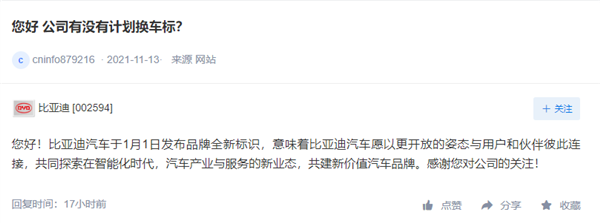 11月18日早間消息,在昨日與投資人在互動(dòng)平臺(tái)交流時(shí),有提問“公司有沒有計(jì)劃換車標(biāo)?”。 對(duì)此,比亞迪方面回應(yīng)表示,“比亞迪汽車于1月1日發(fā)布品牌全新標(biāo)識(shí),意味著比亞迪汽車愿以更開放的姿態(tài)與用戶和伙伴彼此連接,共同探索在智能化時(shí)代,汽車產(chǎn)業(yè)與服務(wù)的新業(yè)態(tài),共建新價(jià)值汽車品牌! 原來,今年1月1日,比亞迪才發(fā)布了全新的品牌標(biāo)識(shí),取消了橢圓型邊界,寓意比亞迪將秉承更加開放的理念,并通過字母變形打開了BYD三個(gè)字母封閉空間,讓線條末端如同開放的觸點(diǎn)。 根據(jù)官方表述,全新標(biāo)識(shí)與比亞迪集團(tuán)LOGO及“Build Your Dreams(成就夢(mèng)想)”寓意一脈相承,以簡(jiǎn)約流暢的金屬質(zhì)感線條,構(gòu)成極具“向前”動(dòng)感的“BYD”字樣。通過比例精確、富有規(guī)律的線條排列和變形,賦予新LOGO強(qiáng)烈的設(shè)計(jì)感、科技感和品質(zhì)感。 當(dāng)然,由于比亞迪要推出高端品牌,也不排除為高端品牌啟用新車標(biāo)的可能。日前,比亞迪汽車高端品牌籌備辦公室主任趙長(zhǎng)江暗示系列會(huì)包含一款7座MPV車型。 更早時(shí)候,比亞迪汽車品牌及公關(guān)事業(yè)部總經(jīng)理李云飛表示,高端品牌將于今年第四季度正式發(fā)布。他透露,預(yù)計(jì)車價(jià)區(qū)間在50-80萬,“足以讓人第一眼看見,眼睛就不想離開”。 據(jù)悉,今年前三季度比亞迪實(shí)現(xiàn)營(yíng)業(yè)收入1451.92億元,同比增長(zhǎng)38.25%。 |